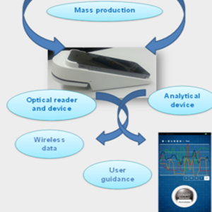 Measures from body fluids (serum, sweat, saliva) sample by disposable Lab-on-chip, which is Roll-to-Roll manufactured